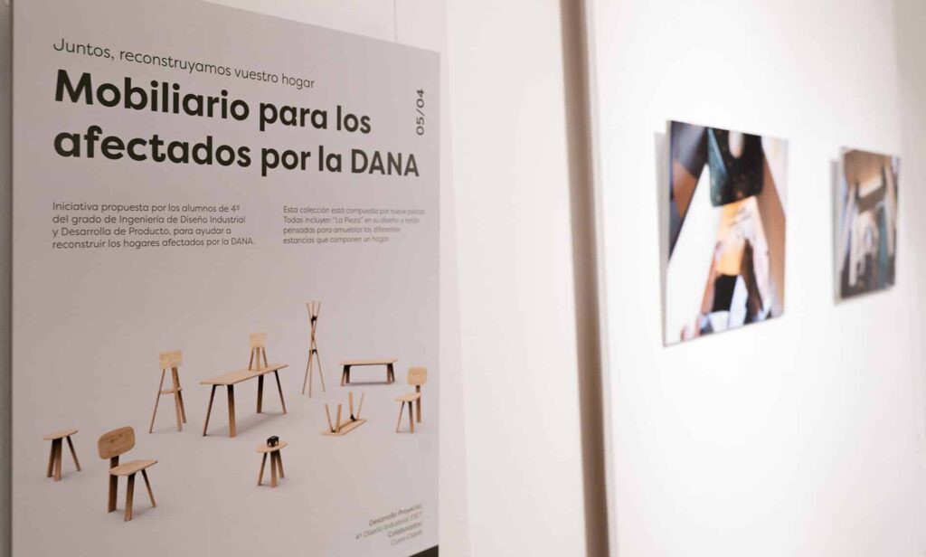 La exhibición “Diseño para la DANA” presenta una colección de muebles creada por un grupo de estudiantes del Grado en Ingeniería del Diseño Industrial y Desarrollo de Productos. Gracias a su esfuerzo, más de 40 residentes de Catarroja, severamente impactados por las inundaciones, pudieron reponer sus sillas, mesas, bancos, taburetes y percheros. Esta colección fue diseñada para facilitar el montaje e impulsar así la recuperación habitacional en la zona afectada. La iniciativa fue coordinada por los profesores Miguel Roldán y Jordi Ardanuy.