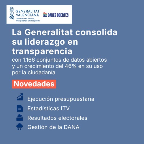 Desde el inicio de la legislatura en 2023, la Generalitat ha incorporado 42 nuevos conjuntos de datos por iniciativa propia. Entre las novedades se incluyen datos sobre ejecución presupuestaria, estadísticas de la ITV y resultados electorales, así como información prioritaria relacionada con la gestión de la dana, que abarca contratos, subvenciones y ERTEs. Esto garantiza un acceso público a la información sobre la gestión de emergencias.