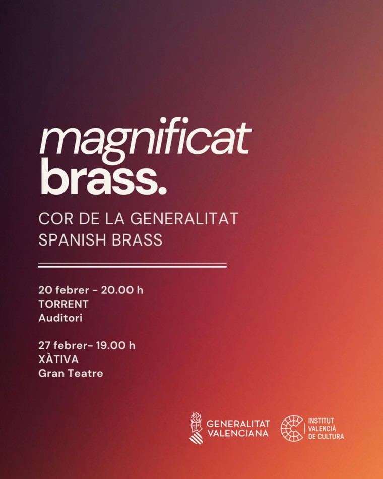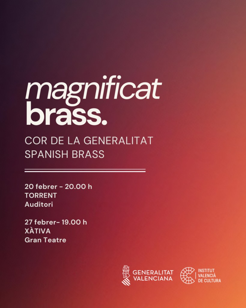 El Cor de la Generalitat y el quinteto de metales Spanish Brass se unen para presentar el concierto ‘Magnificat Brass’ en las localidades de Torrent y Xàtiva. Bajo la dirección de Jordi Blanch Tordera, el evento tendrá lugar el viernes 20 de febrero a las 20:00 horas en el Auditori de Torrent, mientras que el 27 de febrero, también a las 20:00 horas, se llevará a cabo en el Gran Teatre de Xàtiva.