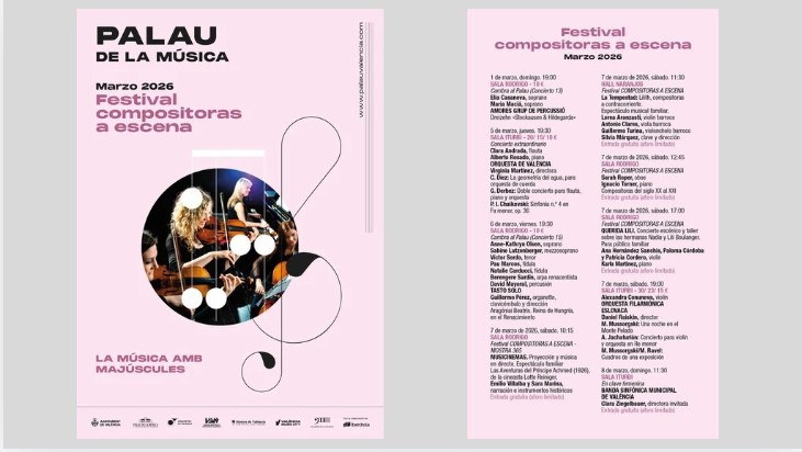 El Festival Compositoras a Escena es una iniciativa organizada por el Palau de la Música de València en colaboración con la Asociación Mujeres en la Música, que celebra el talento femenino en la música. Se lleva a cabo del 1 al 8 de marzo y ofrece una programación variada que incluye conciertos de cámara, propuestas sinfónicas, espectáculos familiares y proyecciones con música en directo.