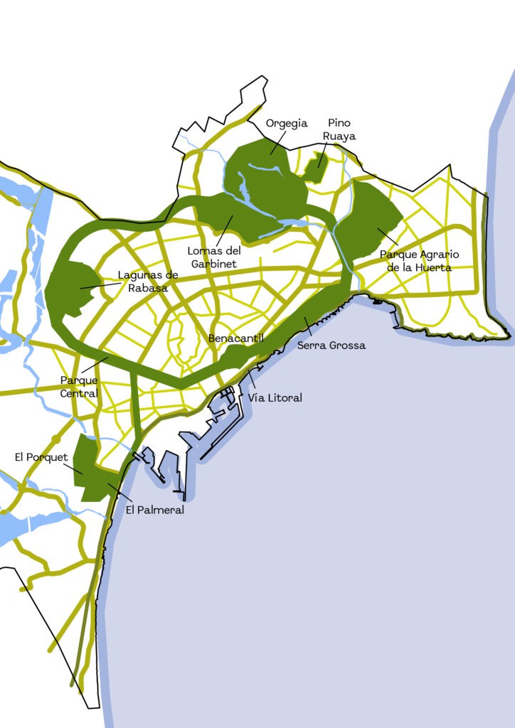 El nuevo cinturón verde integrará diversas áreas naturales como las Lomas de la Vallonga y las Atalayas al oeste, las Lagunas de Rabasa como núcleo central del sistema de humedales interiores, así como otros espacios significativos al norte y al este. Con esta infraestructura, se busca establecer una red continua de zonas verdes que reconecte los espacios naturales periféricos con la ciudad consolidada.